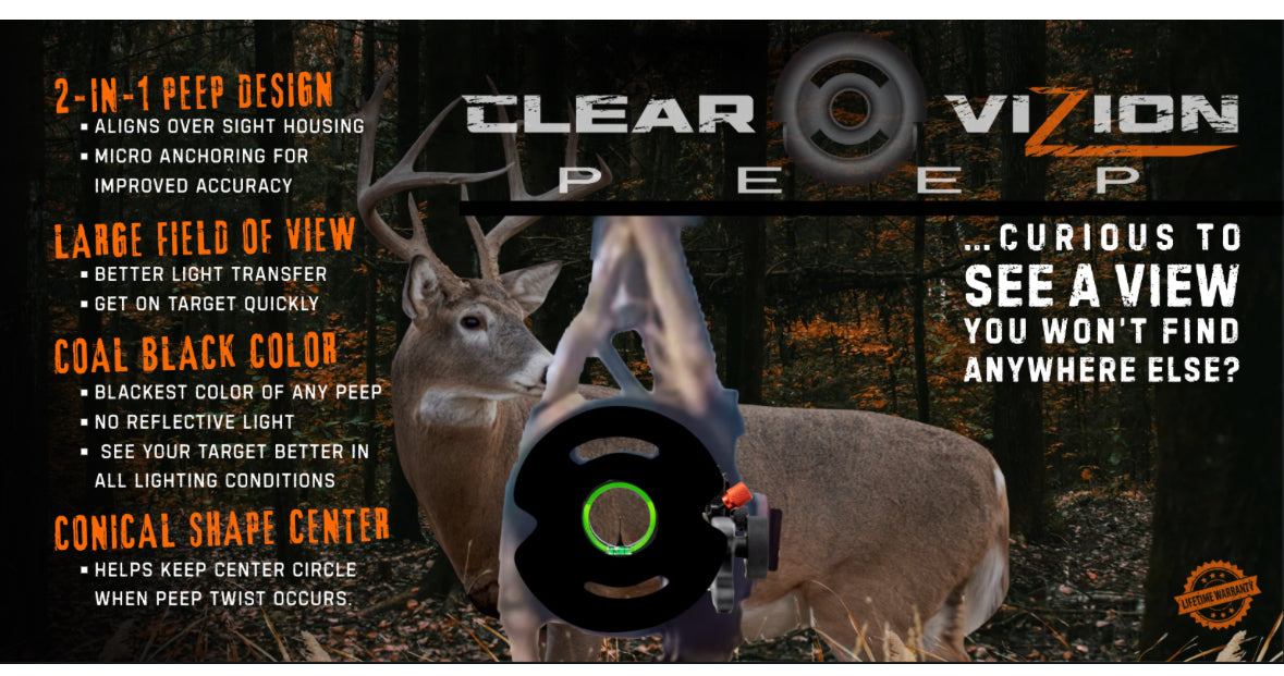 Most advanced peep out there. CVP covers peep sizes 1/8", 5/32" and 3/16". Two in one peep design. 1) Improves accuracy with micro feedback with a center section that overlays your sight and side guides to help you align with your sight housing. No more inconsistent groups, more accurate anchoring with your eye than point of contact with nose or mouth device 2) a better field of view with almost 50% more viewing area to keep you anchored in the moment of truth. No more tunnel vision and lack of ability to quickly find an animal through your peep. 3) hunt until last light with no peep blur to block your vision from your peep sight to your housing and pins. The color is the deepest and darkest black of any black peep. It works in a tree stand, on the ground, or in a ground blind. Enjoy how a peep should really work! Made out PA 12 plus carbon fiber.